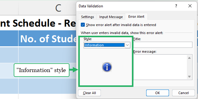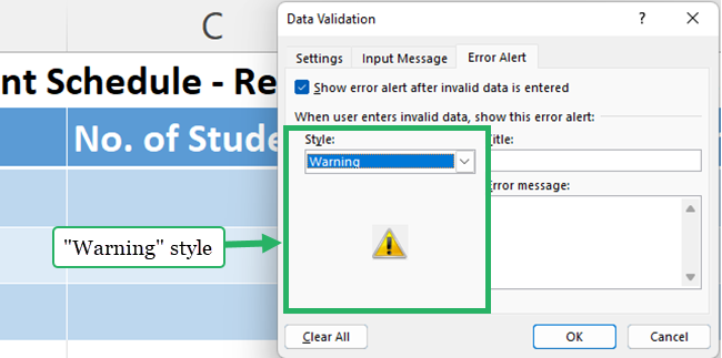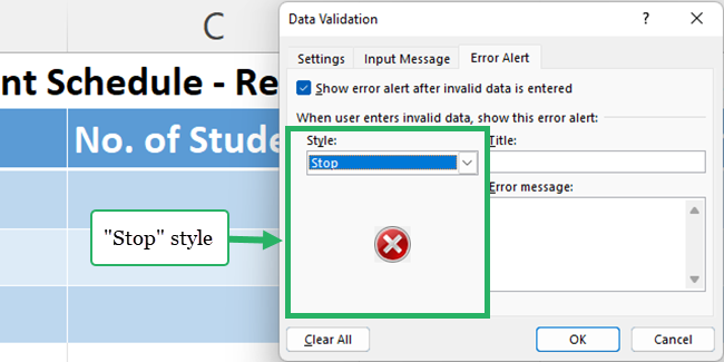 Put a tick mark next to the βshow error alert after invalid data is enteredβ in the error alert tab.