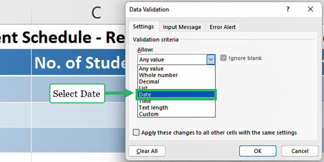 By selecting “date”, restrict data entry types to date in the validation cell.