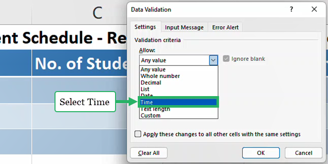 By selecting “Time”, all other entries other than time will become invalid entries in data validation cells.
