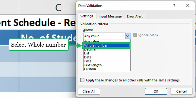 - Select the “Whole number” as the data validation criteria from the settings tab.