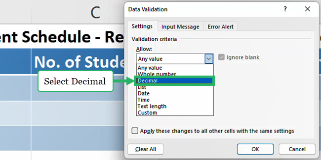 - Select “Decimal” as the data validation criteria from the settings tab.