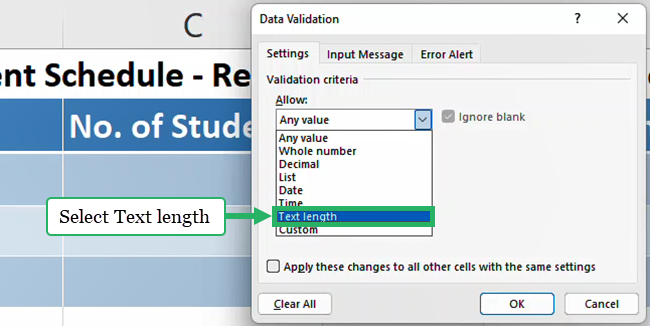 - Select the “Text length” as the data validation criteria from the settings tab.