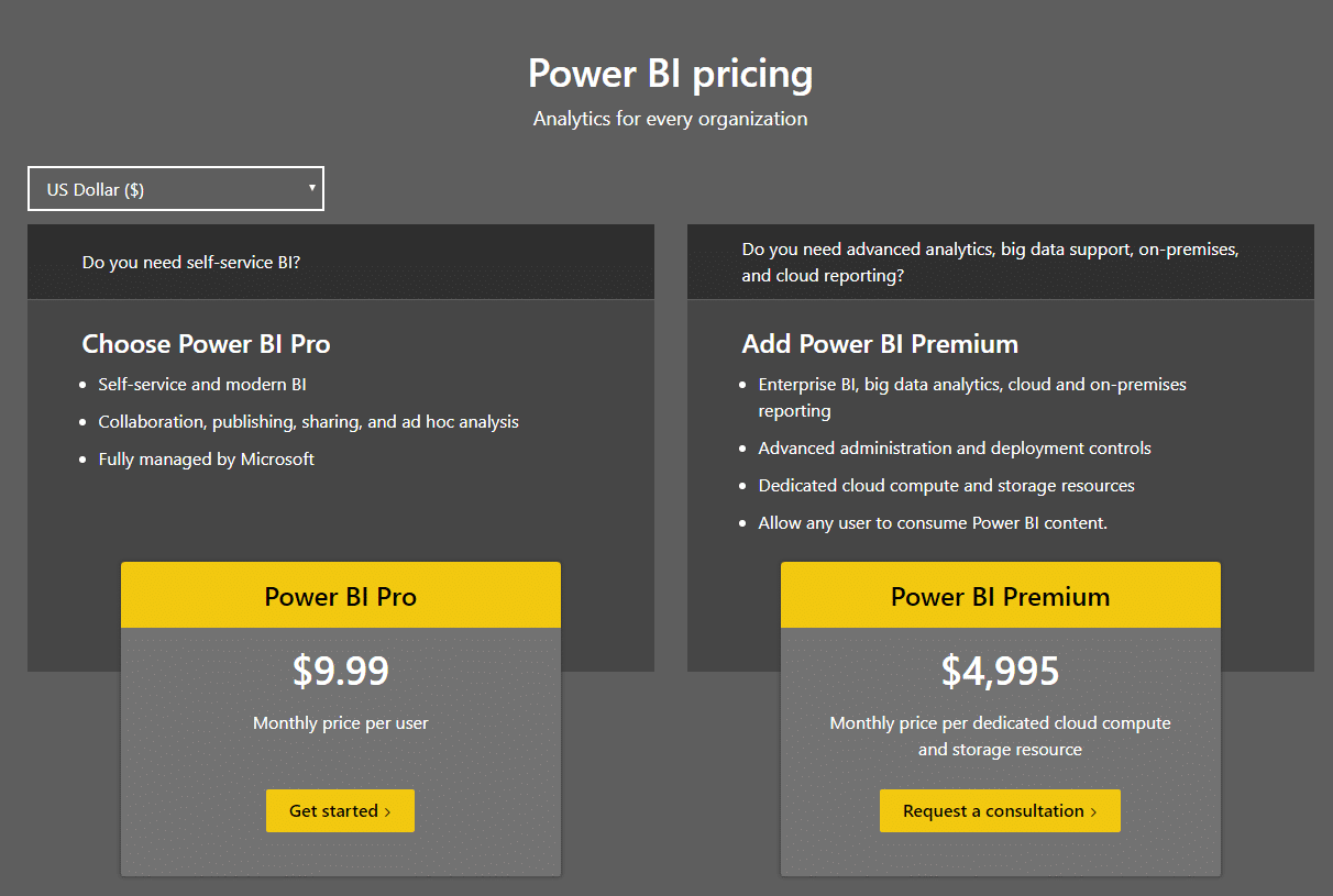 - Power BI Pro at $9.99 per month per user